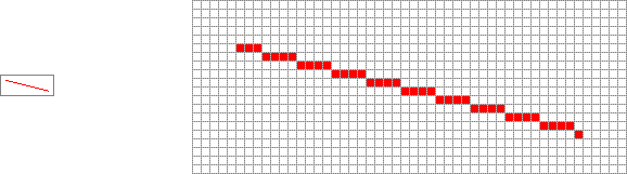 Notice that the line from the vector image appears smoother than in the raster image. This is because even though pixels are small enough to be visibly perceived as single points, they are not small enough so that every point on a line falls exactly on a single pixel. To understand this, we will plot a line from the start and end points of the raster image on the zoomed grid:
