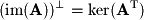 An orthogonal complement to a subspace is the vector perpendicular to all the vectors in that subspace. A common example is a plane's normal vector. A normal is the orthogonal complement of a plane. The following are formulas that relate kernels and images. You should know these formulas. In the following the orthogonal complement of